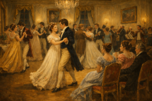 Austen offers another illuminating example in Pride and Prejudice (1813), where conversation itself becomes a subtle social performance during a dance between Elizabeth Bennet and Mr. Darcy at the Netherfield ball: