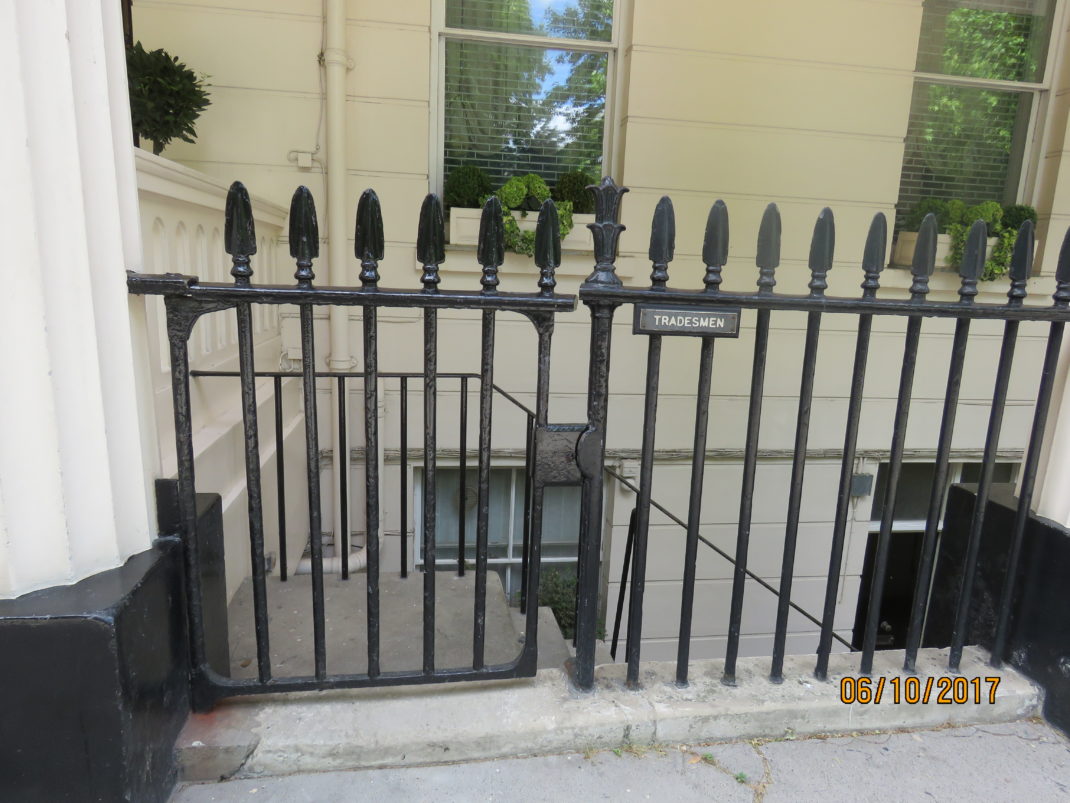 The servants entrance however, is accessed through a gate in the wrought iron fence. Today, these wrought iron fences are mostly black or gray, a tradition that started in the Victorian Era. However, during the Regency, these fences could be any color, shades of blues and greens seemed most popular. The gate in the fence which lead to the servants entrance below was locked at night. To get to the servants’ entrance one must go through the gate, down a step and sometimes winding flight of stairs, across a small area open to the sky, and then through the kitchen door which was often almost directly below the front door.